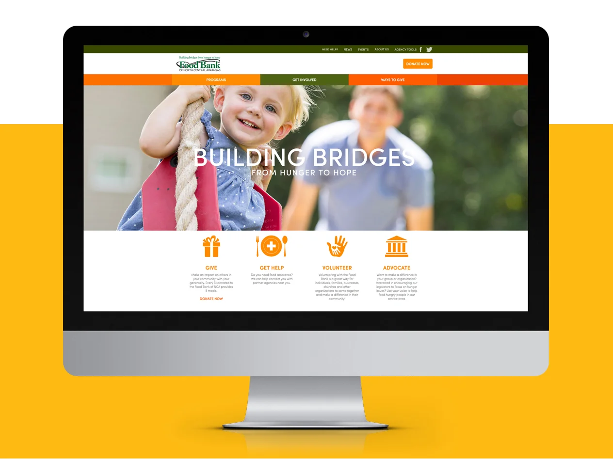 Incorporating the green from Feeding America® and the orange in Share Our Strength’s No Kid Hungry Campaign, the Food Bank of North Central Arkansas’ new branding visually shows the partnership between these organizations and their common goal to help end hunger in America.